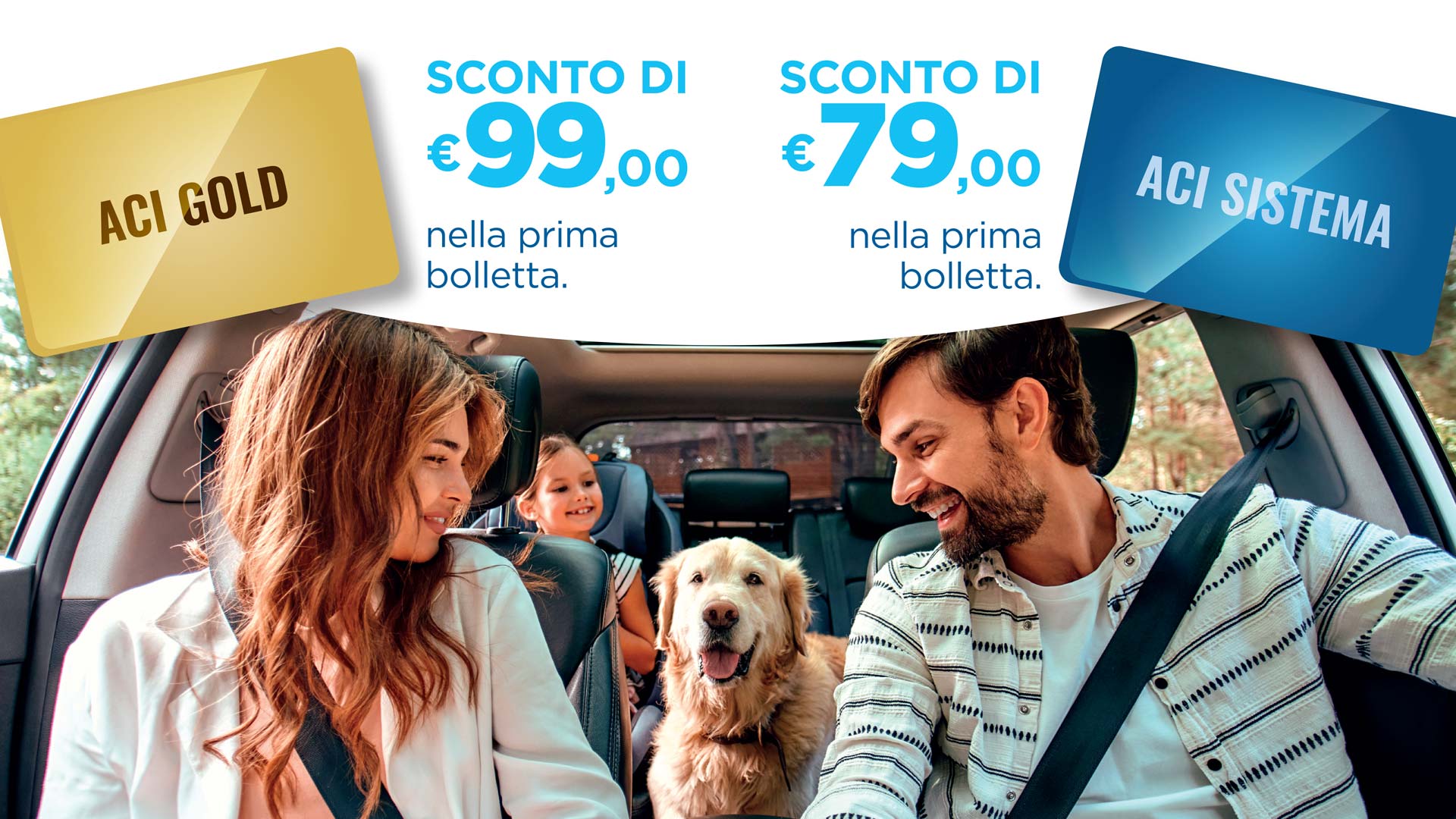 Riceverai uno sconto direttamente in bolletta di € 79 (se sei titolare di Aci Sistema) oppure di € 99 (se sei titolare di ACI Gold). In caso di più forniture, l’importo dello sconto sarà erogato in quote fino a concorrere al totale dello sconto spettante.