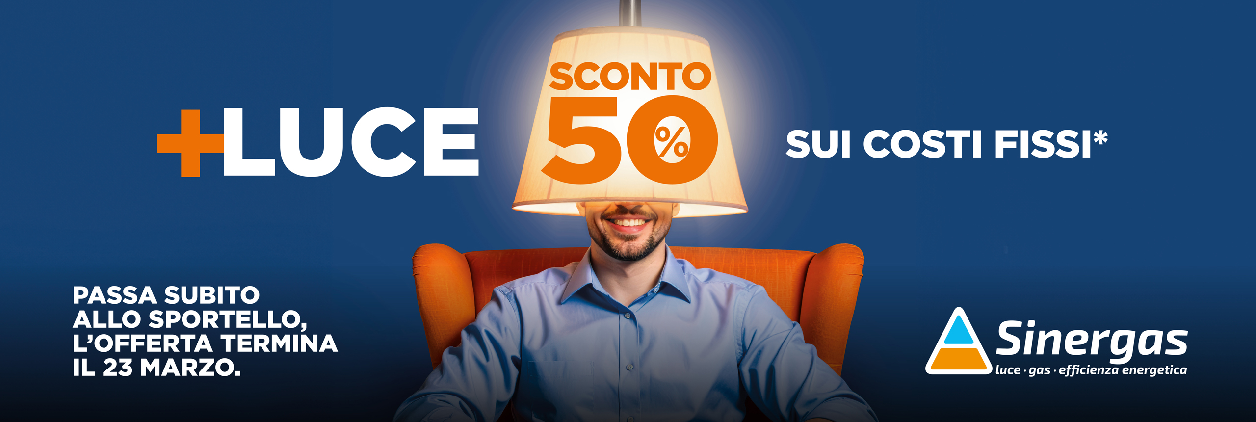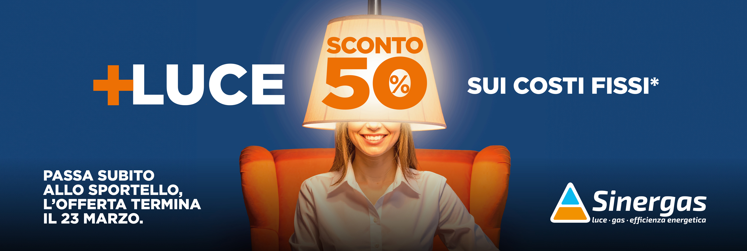 * Le offerte PIU’ LUCE prevedono il 50% di sconto sulla quota fissa di commercializzazione di 144 €/POD/anno, fino a 24 mesi. Il valore dello sconto è pari a -72€/POD/anno. Valide per forniture di energia elettrica ad uso domestico. Per maggiori informazioni sulle condizioni passa allo sportello più vicino. Offerta non cumulabile con altre iniziative in corso.